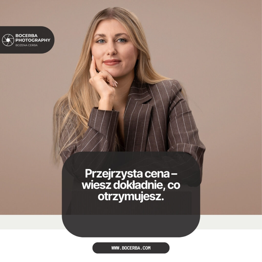 Dlatego zawsze pokazuję ceny wprost. Wielu klientów waha się, czy to dobry moment na inwestycję w profesjonalną sesję. Konkretne liczby ułatwiają decyzję – wiesz, ile płacisz i co dokładnie dostajesz.